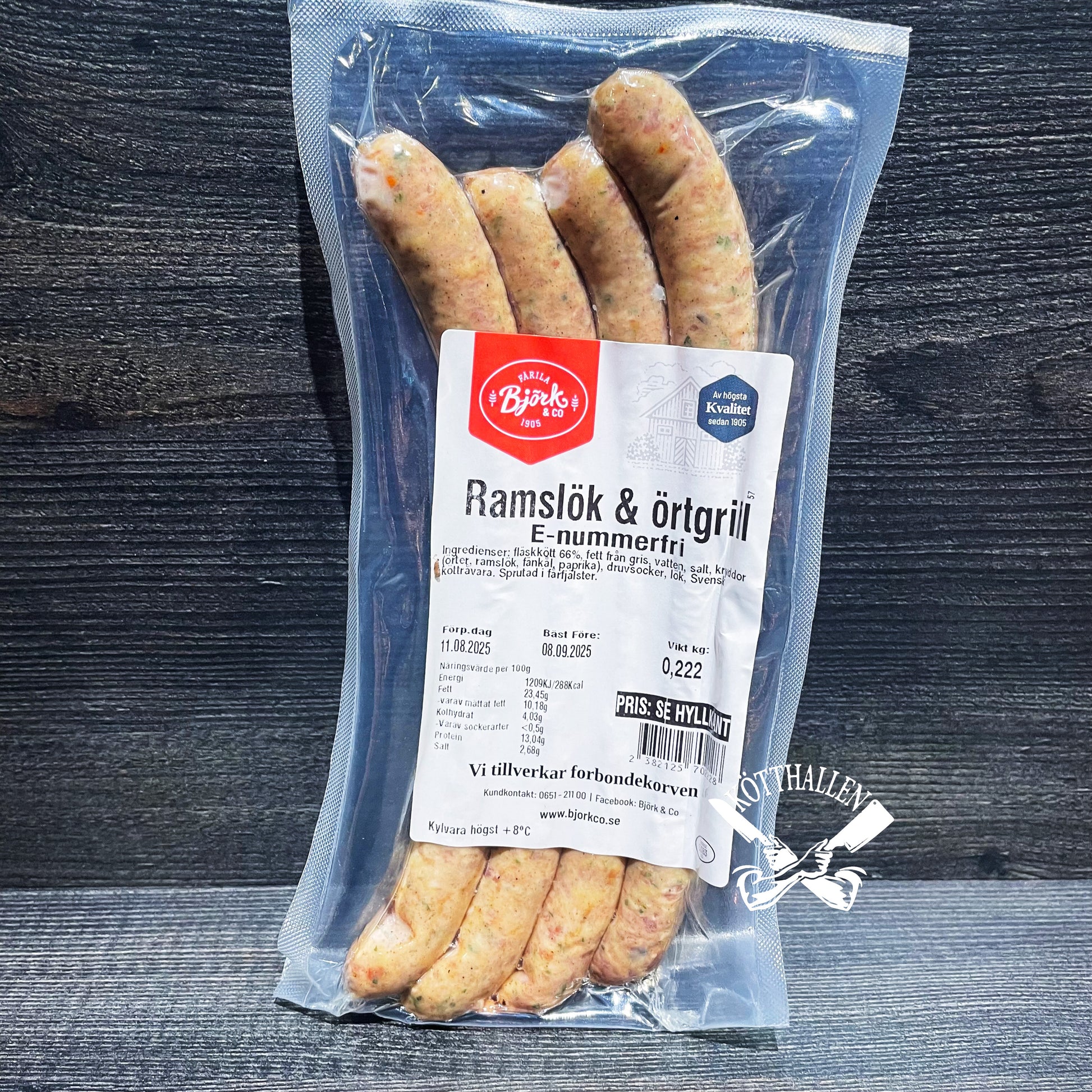 Saftig svensk grillkorv gjord på fint fläskkött och rikligt med ramslök och örter. E-nummerfri och fylld med rena smaker som lyfter varje grillkväll: mild vitlökskaraktär, fräsch örtighet och härligt tugg med bra snäpp i skinnet. Lägg direkt på gallret eller stek i panna – korven är lika hemma i bröd som skivad i en krämig pastasås. En enkel, ärlig favorit som gör det lätt att bjuda stort.
