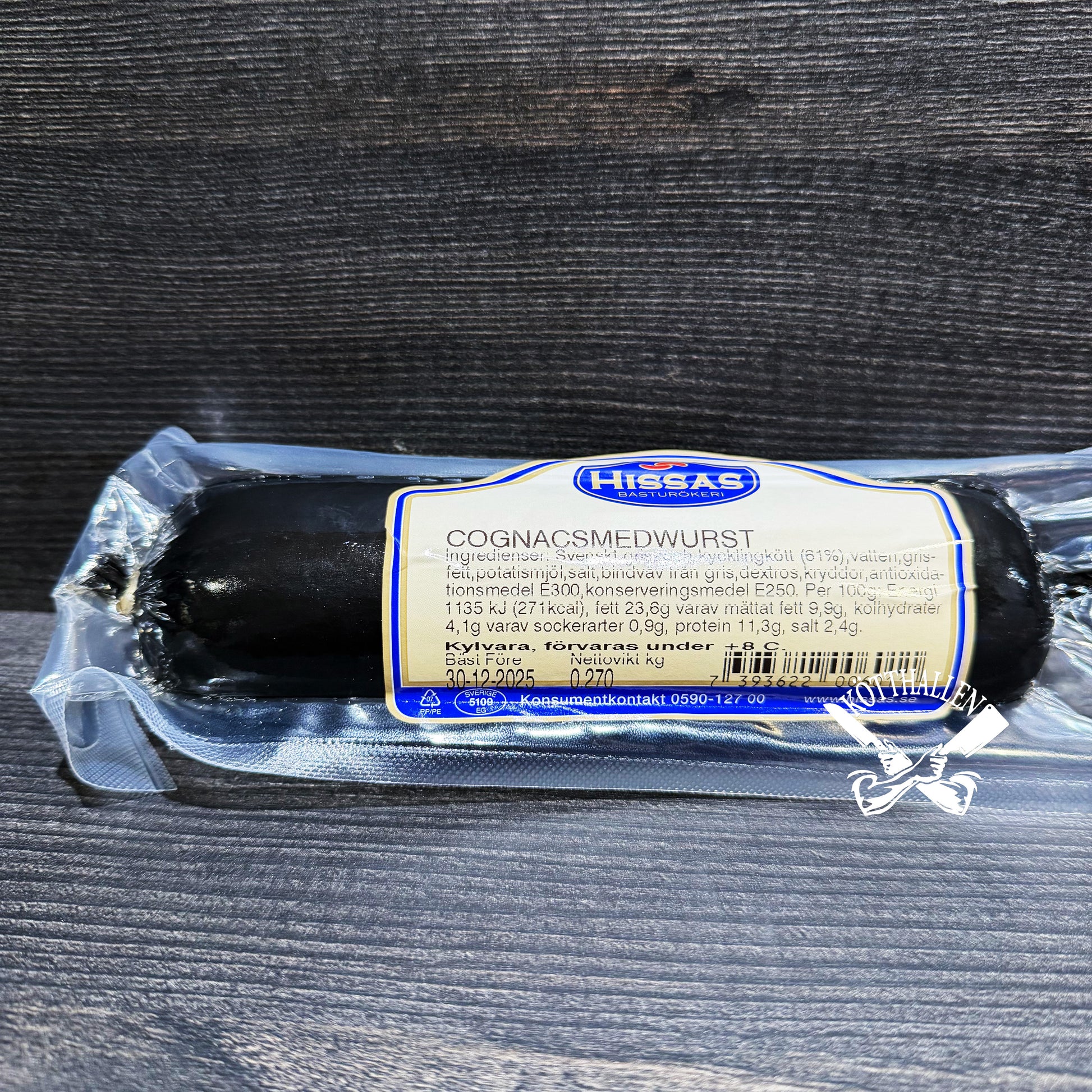 • En fyllig och smakrik cognacsmedwurst från Hissas Basturökeri – tillverkad på svenskt kött och förfinad med en hint av cognac som ger en rund, aromatisk karaktär. Perfekt på smörgåsen, i charkbrickan eller som delikat tillbehör till ett glas rött.
