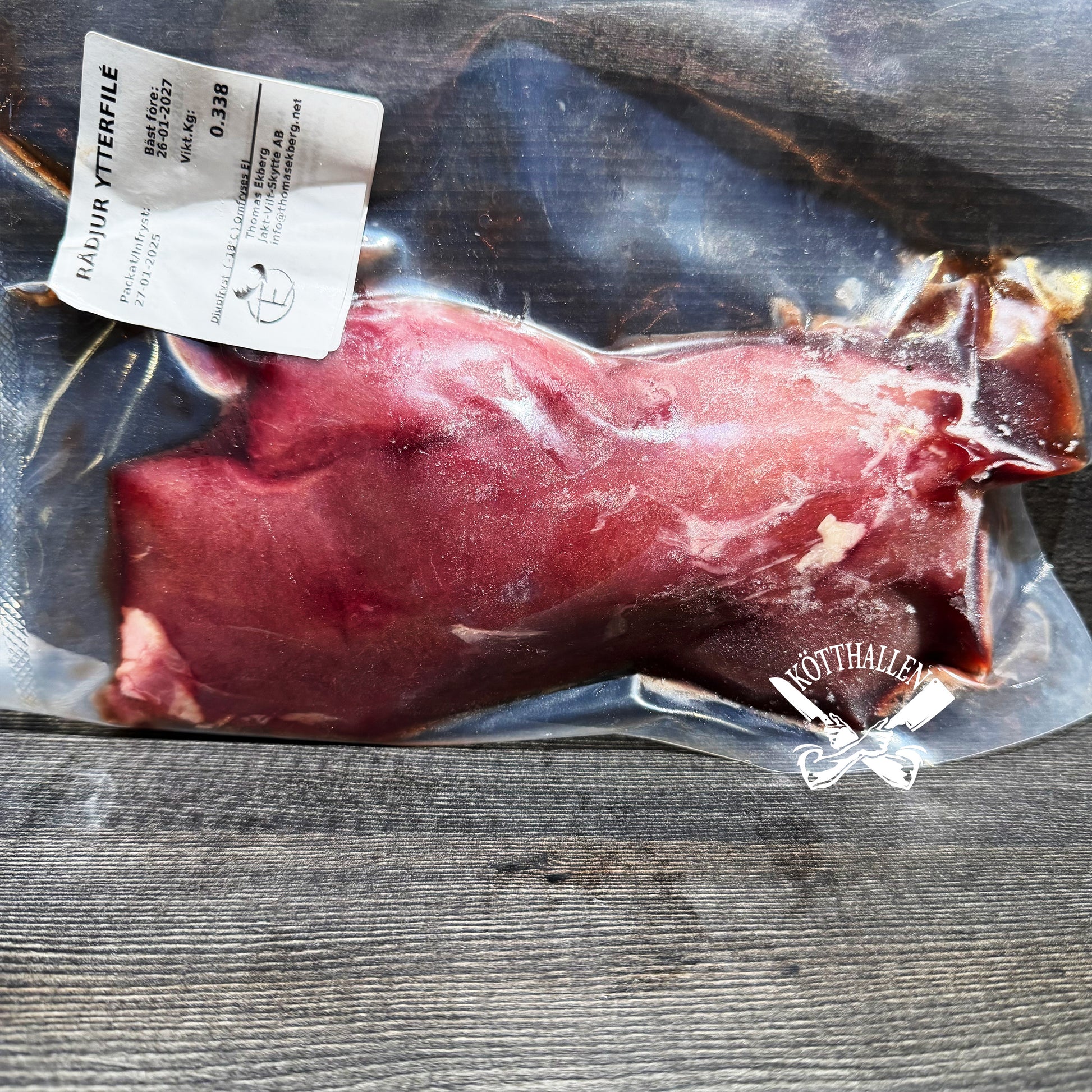 Rådjursytterfilé är en riktigt elegant viltdetalj som kombinerar smak, mörhet och mångsidighet på bästa sätt. Den sitter längs ryggen, precis som på större vilt, men eftersom rådjuret är ett mindre djur får du en bit som är nätt, jämn och otroligt lätt att hantera. Smaken är mild, ren och lite sötaktig – typiskt rådjur – och ytterfilén har en fin fasthet som gör den perfekt att steka eller grilla.