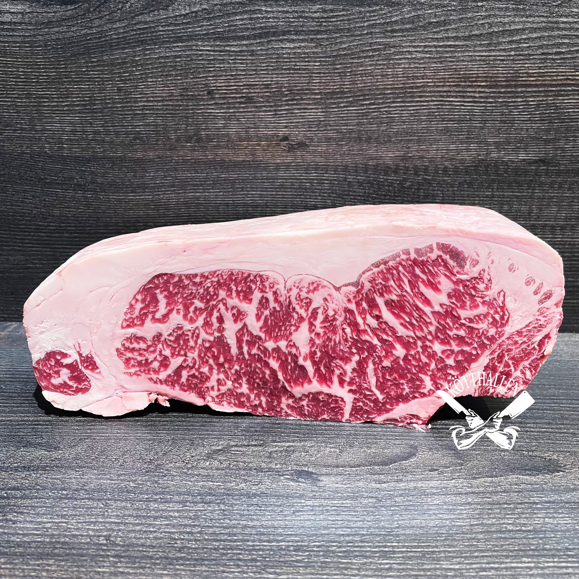 Ädeldetalj av certifierad amerikansk F1 Wagyu (50% Wagyu 50% Angus) från välrenommerade Snake River Farms. Klassificerad som "SRF Gold Grade" (motsvarar BMS 9-12) vilket är Snake River Farms högsta klass och exporteras normalt sett inte till Europa.