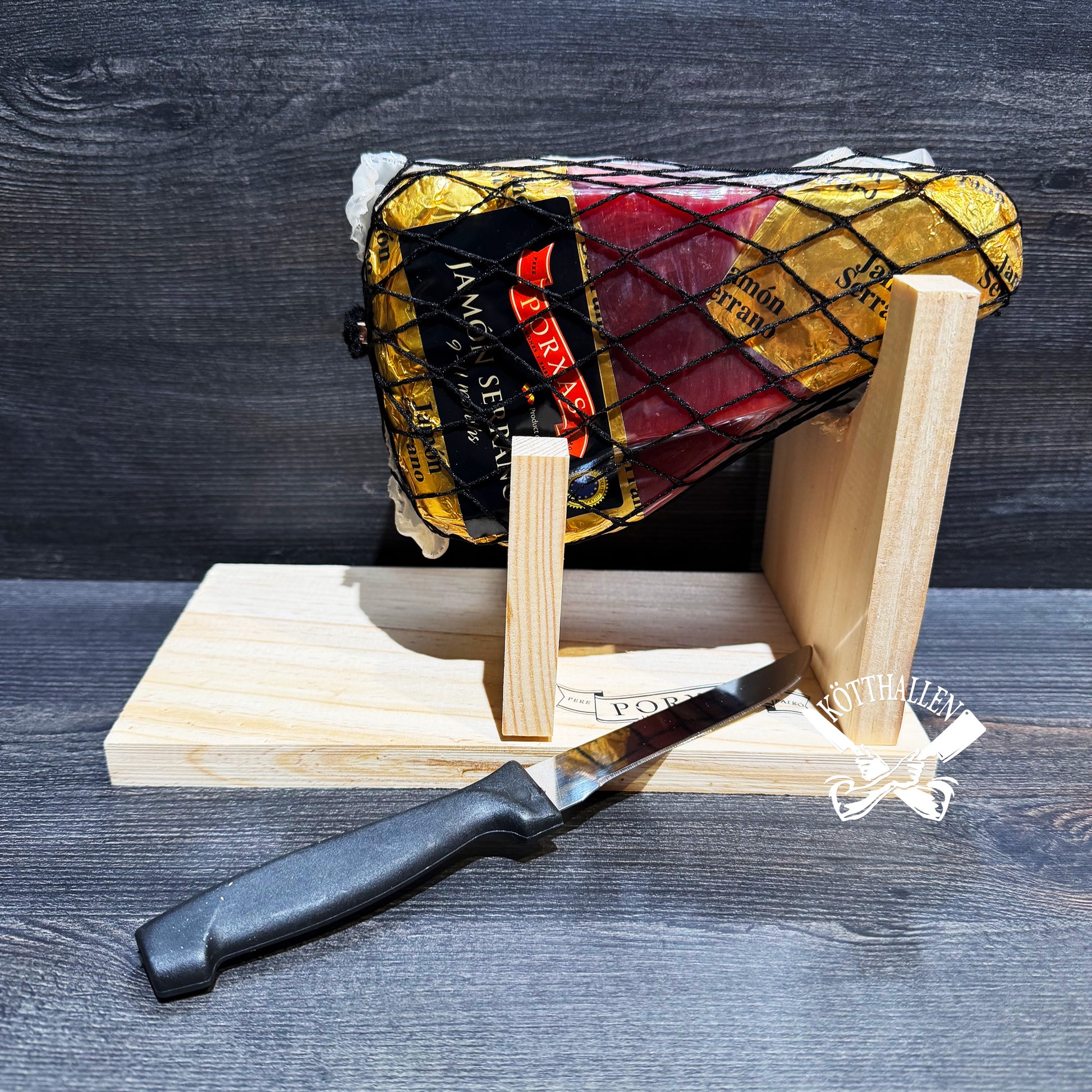 - Lufttorkad Serranoskinka, levereras med ställ och kniv.