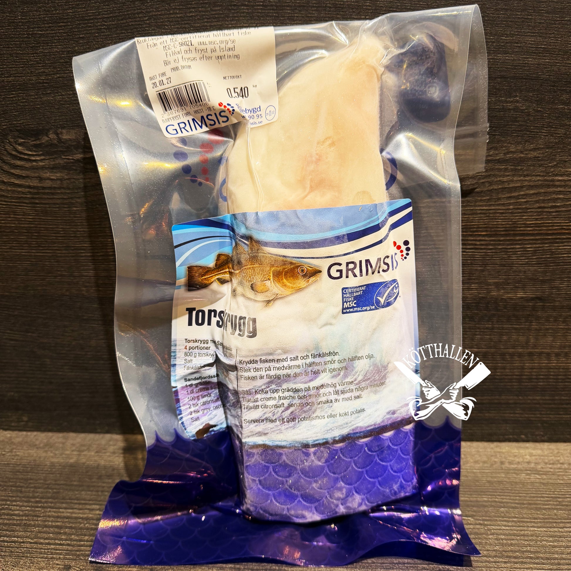 - Grimsis torskrygg är en riktig premiumfisk – tjock, vit och mjäll med en ren havssmak. Fiskad i Islands iskalla vatten och fryst direkt för att bevara friskheten. En självklarhet till fiskgratängen, med brynt smör eller klassiskt serverad med potatis och ärtor.